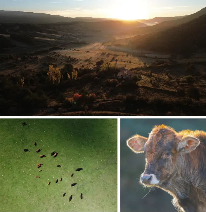 El manejo en Mas del Cubillo se rige por principios de gestión holística, buscando equilibrar la producción de carne de pasto de alta calidad con la conservación del medio ambiente.